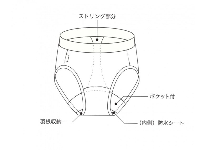クロッチは羽根を折り込める2重構造で、ナプキンを前後に差し込んで使うポケット付き。
